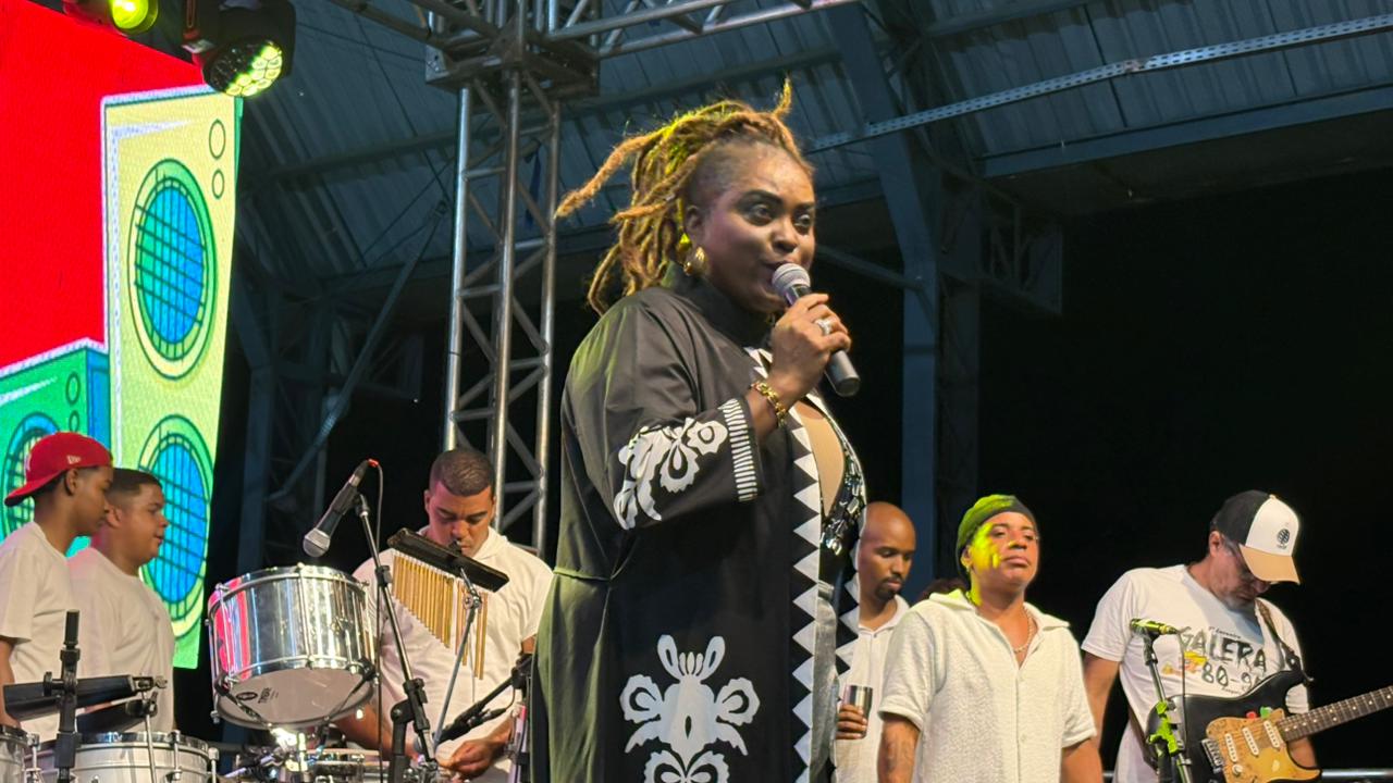 Ao comentar o repertório preparado para a noite, ela ressaltou a diversidade musical do show. “Ave Maria, não foi difícil preparar não, viu? A gente tem um pouquinho de Lulu, a gente tem Brown, a gente tem Margareth Menezes, a gente tem Saulo. Então uma mistura eclética fantástica e o swing da percussão daquele jeito.”