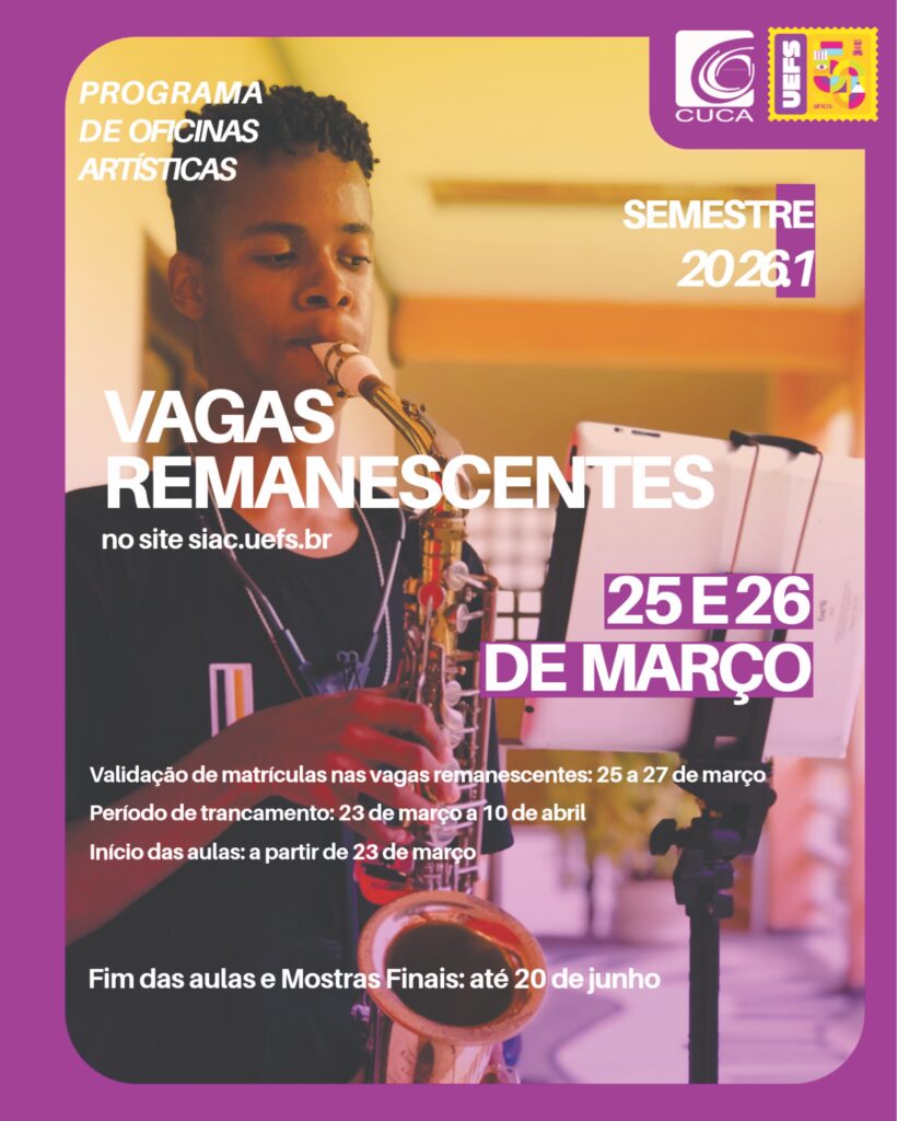 O Centro Universitário de Cultura e Arte da Uefs (Cuca/Uefs) abre matrículas nas vagas remanescentes do Programa de Oficinas Artísticas 2026.1 para mais de 500 vagas entre os dias 25 e 26 de março. Essa quantidade disponível corresponde às vagas que não foram preenchidas por estudantes da casa ou pelos inscritos em sorteio eletrônico em etapas anteriores. O procedimento é exclusivamente online e realizado através do site https://siac.uefs.br por ordem de chegada a partir da meia-noite do dia 25.